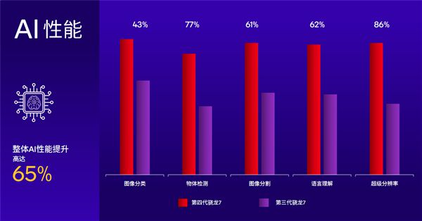 AI是如今移动平台的关键之处,第四代骁龙7的整体AI性能比前代提升了多达65%,在图像分类、购物体验、图像分割、语言理解、超级分辨率等各方面都实现了长足的进步,并支持一系列的行业主流AI模型,包括百度文心、腾讯混元、面壁智能、DeepSeek、RWKV等等。